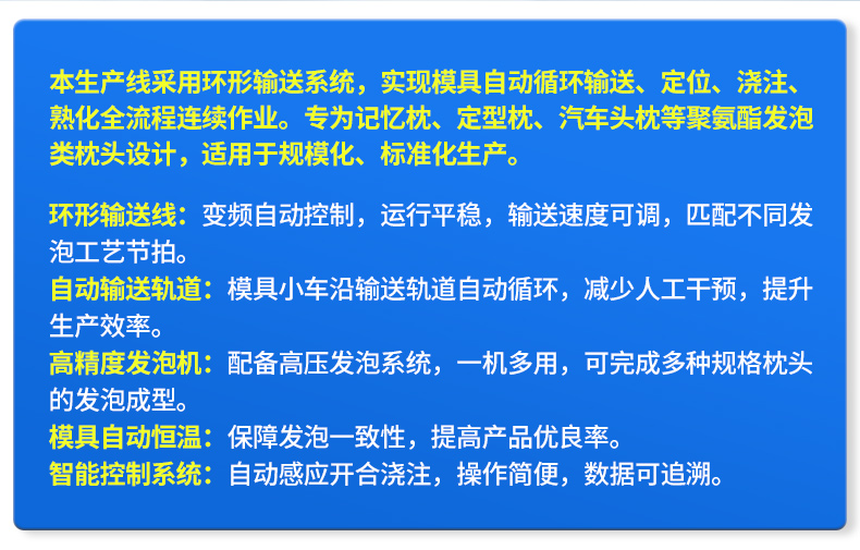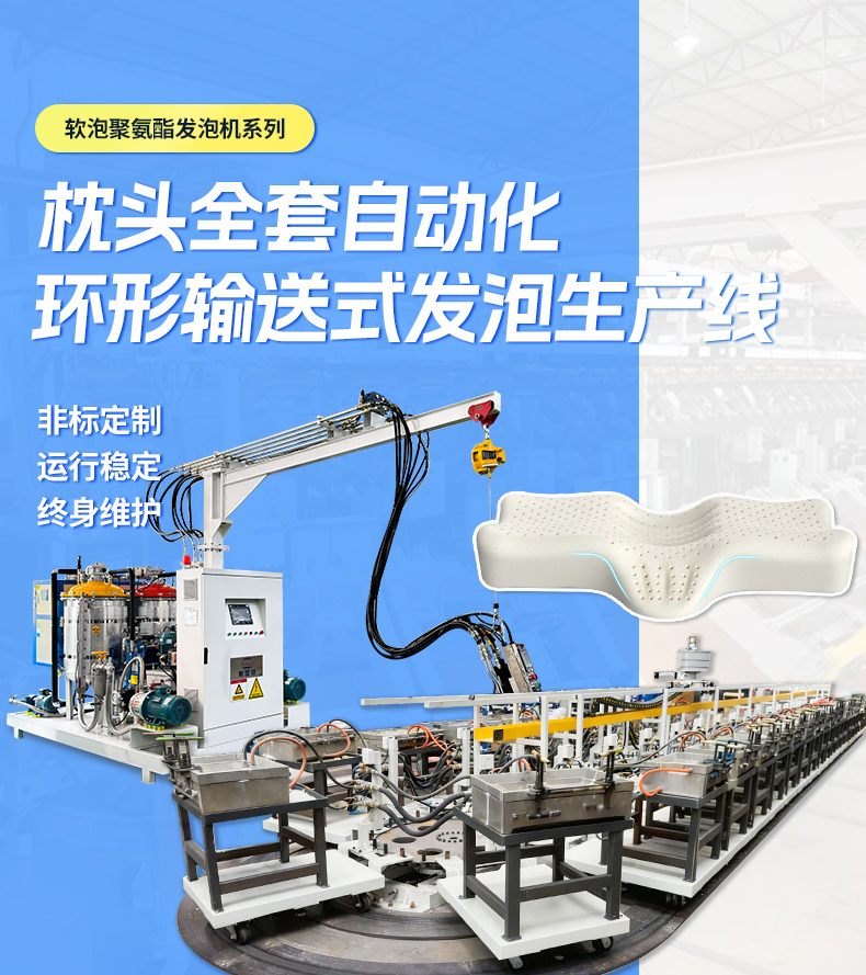 枕頭環(huán)形輸送式發(fā)泡生產(chǎn)線優(yōu)勢(shì):